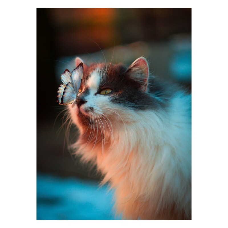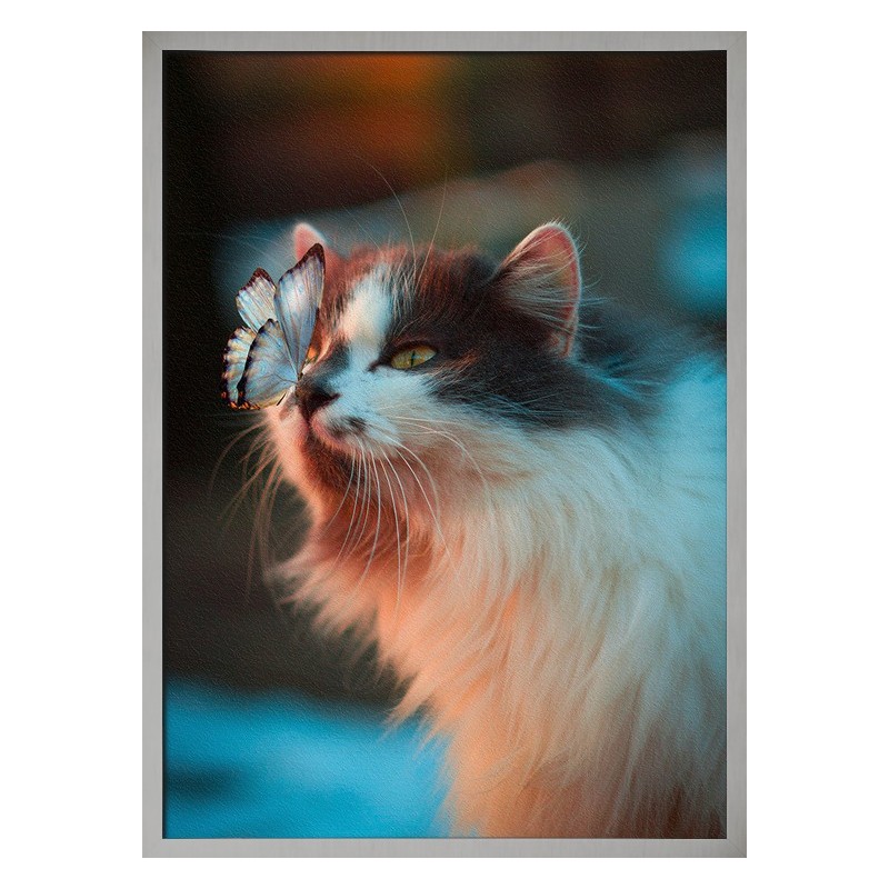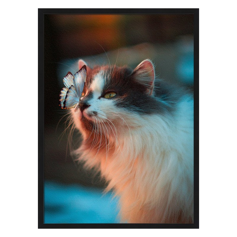 Kvalitní topný obraz s motivem motýla a jeho kočičího přítele, české výroby.